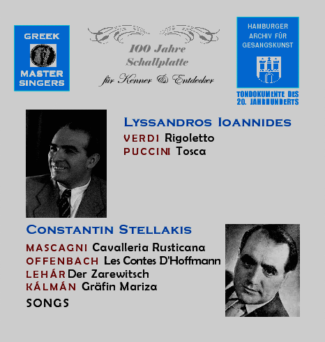 Lyssandros Ioannides Tenor - Griechenland Aufnahmen 1935 VERDI Rigoletto PUCCINI Tosca Constantin Stellakis Tenor - Griechenland Aufnahmen 1930 - 1940 MASCAGNI Cavalleria Rusticana OFFENBACH Les Contes d'Hoffmann LEHÁR Der Zarewitsch KÁLMÁN Gräfin Mariza Italienische und griechische Lieder