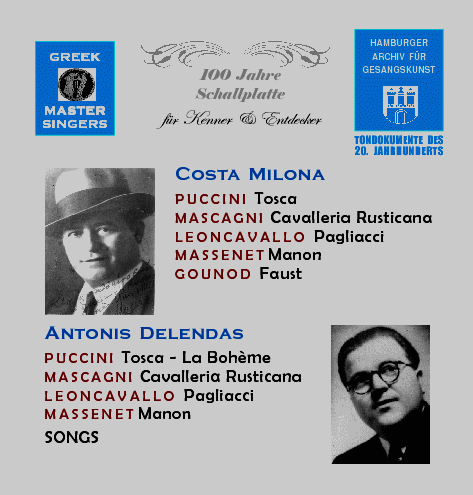 Costa Milona Tenor - Griechenland Aufnahmen 1925 - 1931 MASCAGNI Cavalleria Rusticana PUCCINI Tosca LEONCAVALLO Pagliacci MASSENET Manon GOUNOD Faust Antonis Delendas Tenor - Griechenland Aufnahmen 1934 MASCAGNI Cavalleria Rusticana PUCCINI Tosca LEONCAVALLO Pagliacci MASSENET Manon Italienische und griechische Lieder