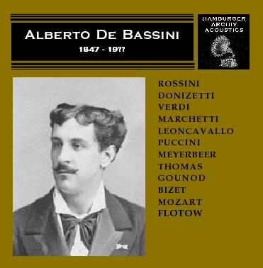Alberto de Bassini (1847-19??) Italienischer Bariton Aufnahmen 1898-1904 ROSSINI Il Barbiere di Siviglia DONIZETTI Gianna di Calais - La Favorita BELLINI La Sonnambula VERDI Rigoletto - Il Trovatore - Ballo in Maschera - Otello MARCHETTI Ruy Blas LEONCAVALLO I Pagliacci MEYERBEER L'Africaine THOMAS Mignon GOUNOD Faust - Philemon et Baucis BIZET Carmen MOZART Don Giovanni FLOTOW Martha Lieder: Cottrau - Mattei - Scuderi
