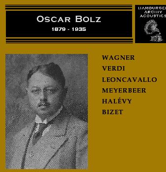 Oscar Bolz (1879 - 1935) Tenor / Deutschland Aufnahmen 1907-1925 WAGNER Lohengrin - Tannhäuser - Walküre - Meistersinger VERDI Troubadour - Aida - Othello LEONCAVALLO Der Bajazzo MEYERBEER Der Prohet - Die Afrikanerin HALÉVY Die Jüdin BIZET Carmen