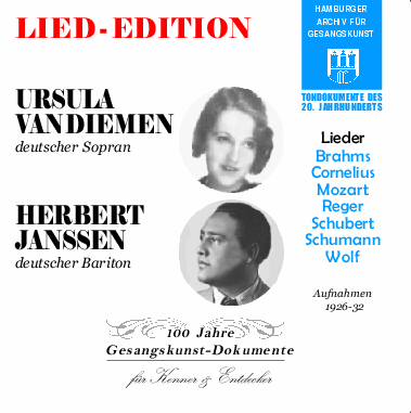 Hugo Wolf01 Verschwiegene Liebe1927; HMV EG 1014; 2.03Franz Schubert02 Wanderers Nachtlied II (Goethe);D786; 1926/10.9.; HMV; 2.2203 An die Musik (Schober); D547;1926; HMV B2546; M.Nr. BW 309; 3.18 Herbert Janssen04 Romanze (Chézy); Rosamunde D797/3b; Piano (Moore); 1938/22.3.; HMV RLS 766.; M.Nr. OEA 6156; 2.4105 Das Wirtshaus (Müller)Winterreise D911/21; Piano (Moore); 1938/22.3.; HMV DB 3496; M.Nr. 2EA 6155 ; 3.5506 Kriegers Ahnung (Rellstab);Schwanengesang D957/2; Pf (Moore); '37; HMV RLS766; M.Nr.2EA2196; 4.16Robert Schumann07 Die beiden Grenadiere (Heine); op.49/1; Piano (Raucheisen); 1936; HMV DB 3024; M.Nr. 2RA 1586; 3.31 Ursula van Diemen