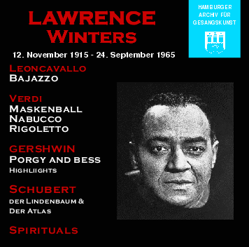 01 Leoncavallo: Der Bajazzo (I Pagliacci) : Schaut her, ich bins! Leopold Ludwig/Orch; 5.13 02 Verdi: Nabucco : Dio di giuda! George Singer/Orch 3.29 03 Verdi: Rigoletto : Feile Sklaven Harry Hermann / RSO Hamburg; 4.20 04 Verdi: Ein Maskenball (Un ballo in maschera) : Eri tu che macchiavi Harry Hermann / RSO Hamburg 5.56 Franz Schubert: 05 Der Lindenbaum 4.15 06 Der Atlas 2.09 Piano : Gerhard Gregor Spirituals: 07 Deep river 2.49 08 Could not hear nobody pray 2.20 09 Nobody knows the trouble I have seen 3.34 10 Still away 4.43 11 Go down, Moses 3.46 Piano : Sylvia Olden-Lee 12 Swing low 3.08 13 Mein Gott, was für ein Morgen 3.55 Harry Hermann / RSO Hamburg & Chor 14 George Gershwin : Porgy and Bess (Highlights / Querschnitt) mit Anneliese Rothenberger RSO Hamburg / Harry Hermann 24.43 Aufnahnmen aus den 50er Jahren Mehr von Lawrence Winters: Lawrence Winters - Edition Vol. 1 (3 CDs) Lawrence Winters - Edition Vol. 2 (3 CDs)